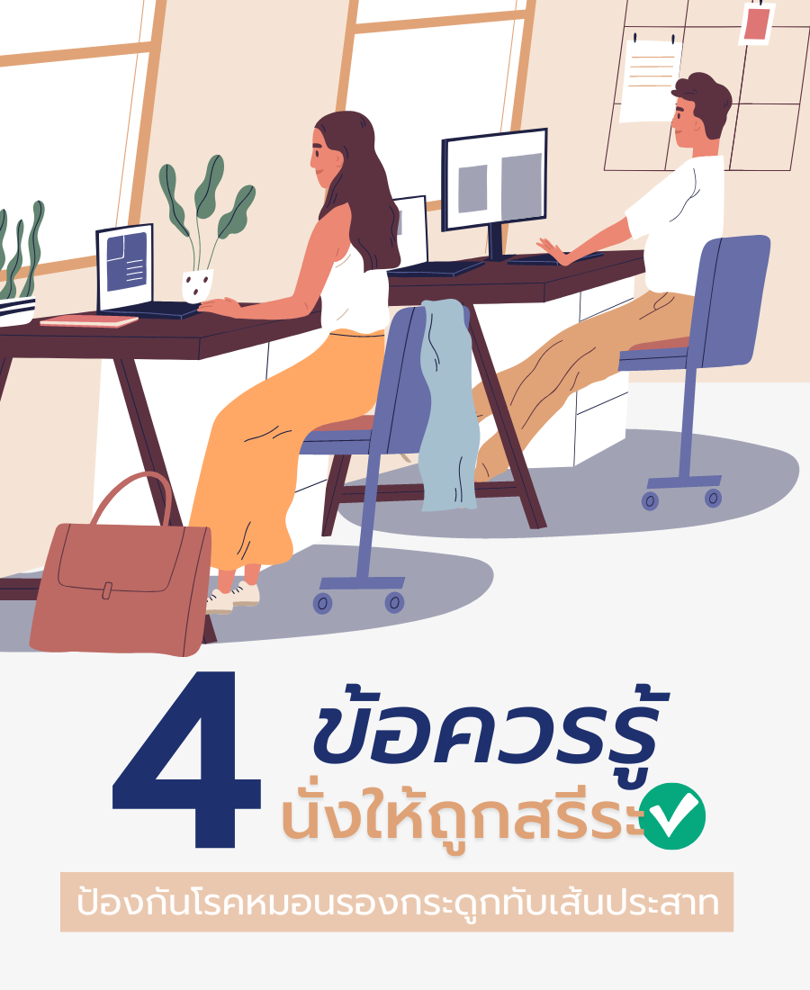 การนั่งเป็นส่วนหนึ่งในชีวิตประจำวัน เราใช้เวลาส่วนใหญ่ไปกับการนั่ง ถึงแม้เราจะรู้ว่านั่งนานเกินไปอาจเป็นอันตรายได้ เพราะทำให้การไหลเวียนของเลือดลดลง แถมถ้านั่งผิดท่ายังเสี่ยงต่อโรคปวดหลังเรื้อรัง โรคปวดสะโพก หมอนรองกระดูกทับเส้นประสาท และโรคอันตรายอีกหลายโรค ฉะนั้น มานั่งให้ถูกท่ากันดีกว่า แล้วนั่งให้ถูกท่าคือนั่งยังไงล่ะ