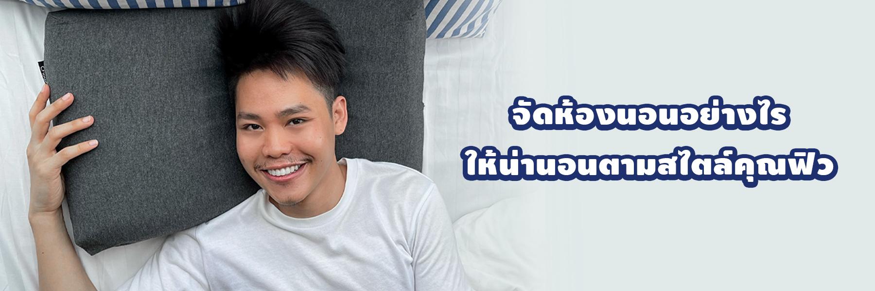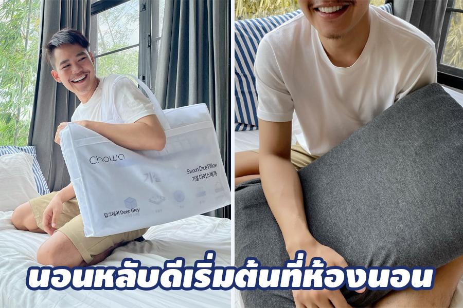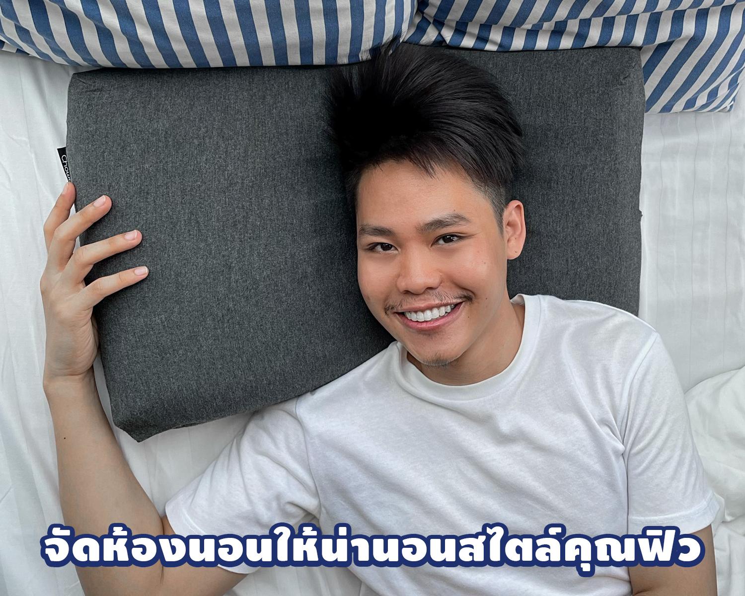 ซึ่งหมอนที่คุณฟิวใช้คือ “หมอนเต๋าสลบเหมือด แบรนด์ CHOWA” วัสดุของหมอนเป็นไฮเปอร์เมมโมรี่โฟมทรงลูกเต๋า 70 ก้อน ซึ่งจะคอยซัพพอร์ตคอและหัวของเรา ปลอกหมอนมีความยืดหยุ่นสูง ให้สัมผัสที่นุ่มลื่นสบาย หัว ต้นคอ บ่า และไหล่ของเรา รู้สึกผ่อนคลาย นอนแล้วเย็น