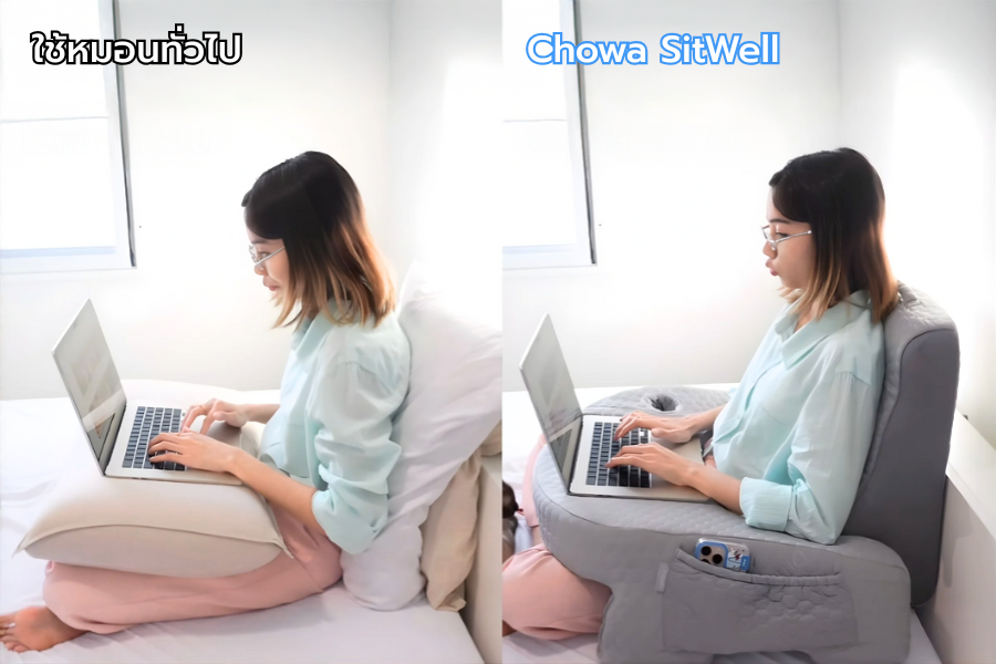 แต่พอเปลี่ยนมาใช้ Chowa SitWell หลังอยู่ในท่าที่ถูกต้องทันที หมอนพิงหลังรองรับสรีระช่วยดันหลังให้ตรง ส่วนหมอนรองแขนก็ช่วยให้กล้ามเนื้อไม่ล้า แขนไม่เมื่อย นั่งนานแค่ไหนก็รู้สึกสบายขึ้นอย่างเห็นได้ชัดค่ะ