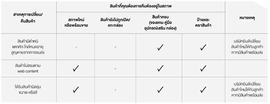 เงื่อนไขการเปลี่ยนสินค้า/คืนสินค้า : สินค้าและบรรจุภัณฑ์ต้องเป็นไปตามเงื่อนไขที่กำหนด มิฉะนั้นบริษัทขอสงวนสิทธิ์ในการรับคืนสินค้า